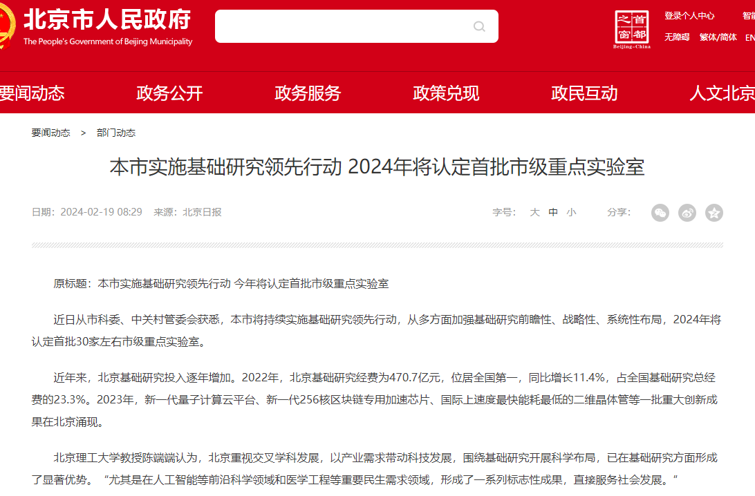 記者近日從市科委、中關(guān)村管委會獲悉,本市將持續(xù)實施基礎(chǔ)研究領(lǐng)先行動,從多方面加強基礎(chǔ)研究前瞻性、戰(zhàn)略性、系統(tǒng)性布局,今年將認(rèn)定首批30家左右市級重點實驗室。 近年來,北京基礎(chǔ)研究投入逐年增加。2022年,北京基礎(chǔ)研究經(jīng)費為470....